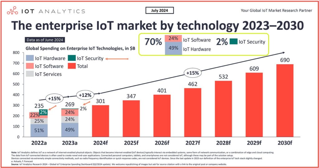 𝐀𝐧𝐨𝐭𝐡𝐞𝐫 (my) 𝐀𝐧𝐚𝐥𝐲𝐬𝐢𝐬 𝐨𝐟 𝐭𝐡𝐞 𝐄𝐧𝐭𝐞𝐫𝐩𝐫𝐢𝐬𝐞 𝐈𝐨𝐓 𝐌𝐚𝐫𝐤𝐞𝐭 𝐛𝐲 𝐓𝐞𝐜𝐡𝐧𝐨𝐥𝐨𝐠𝐲 𝟐𝟎𝟐𝟑–𝟐𝟎𝟑𝟎 The IoT Analytics chart highlights several important trends and potential issues in the enterprise IoT market: 𝐑𝐚𝐩𝐢𝐝 𝐆𝐫𝐨𝐰𝐭𝐡 𝐢𝐧 𝐈𝐨𝐓 𝐒𝐩𝐞𝐧𝐝𝐢𝐧𝐠: ▫ IoT Hardware and Software: Significant investment and growth in IoT hardware (𝟒𝟗%) and software (𝟐𝟒%) indicates a strong focus on developing and […]